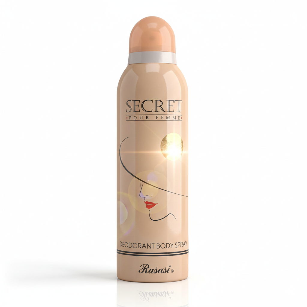 Secret Pour Femme by Rasasi is a soft and elegant deodorant body spray designed for women who love a gentle, feminine fragrance. It provides long-lasting freshness while helping control odor, leaving you feeling confident and beautifully scented throughout the day.